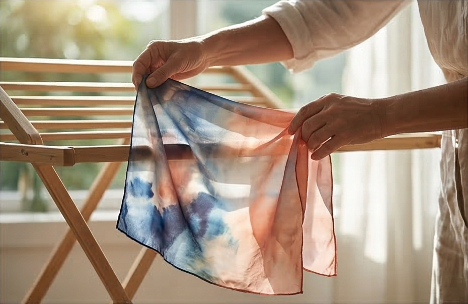 Patience defines our timeline. Each hand-painted piece is left to air-dry naturally, allowing the pigments to settle deeply into the silk, ensuring lasting vibrancy and soul.