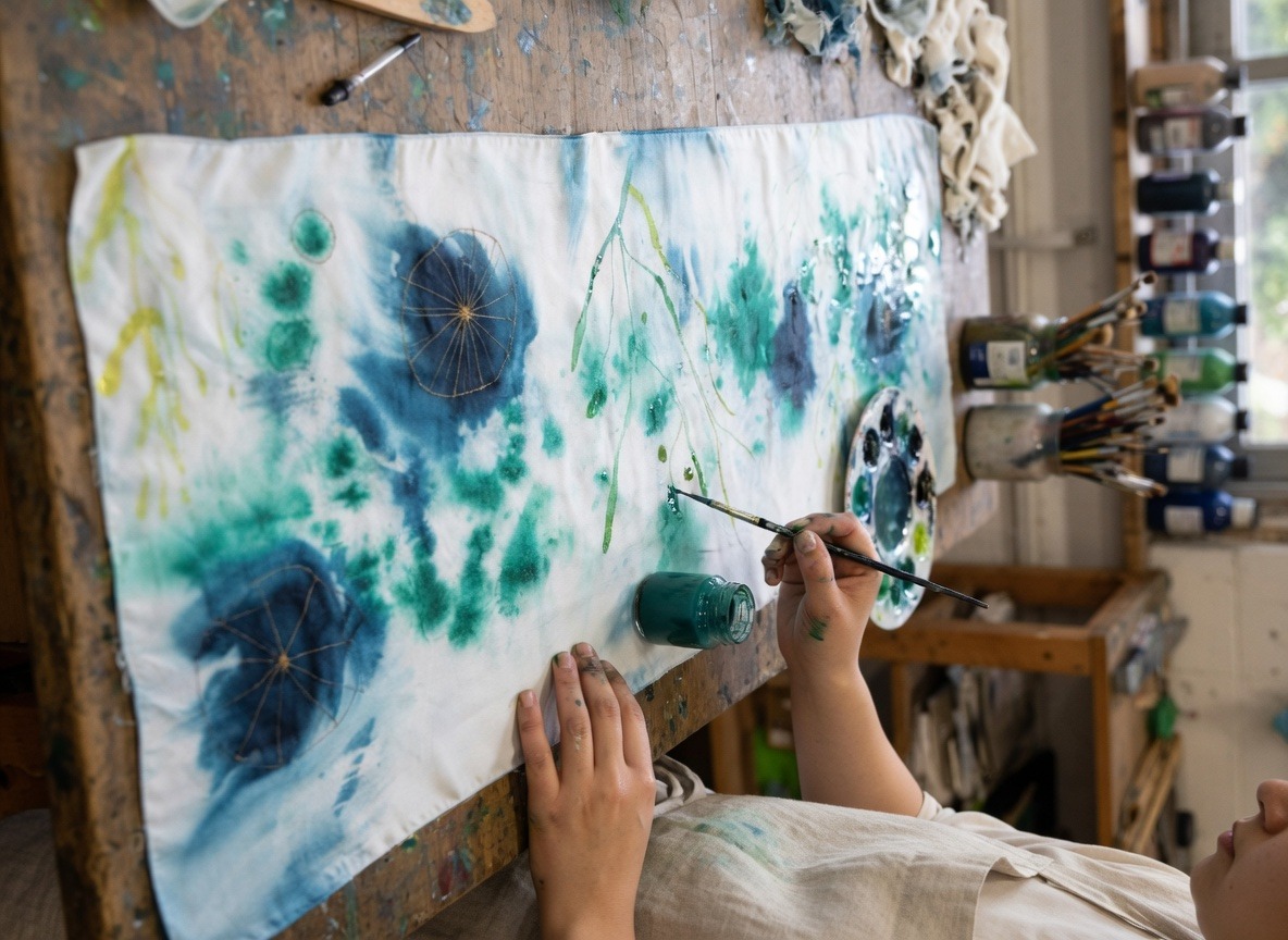 Gamze Haberal does not begin with a sketch. She does not transfer a design from paper to silk, does not follow a pre-planned composition. She begins by looking at the silk — at its particular quality of light on that day, at the way it falls and pools at the edges of the table. Then she begins.