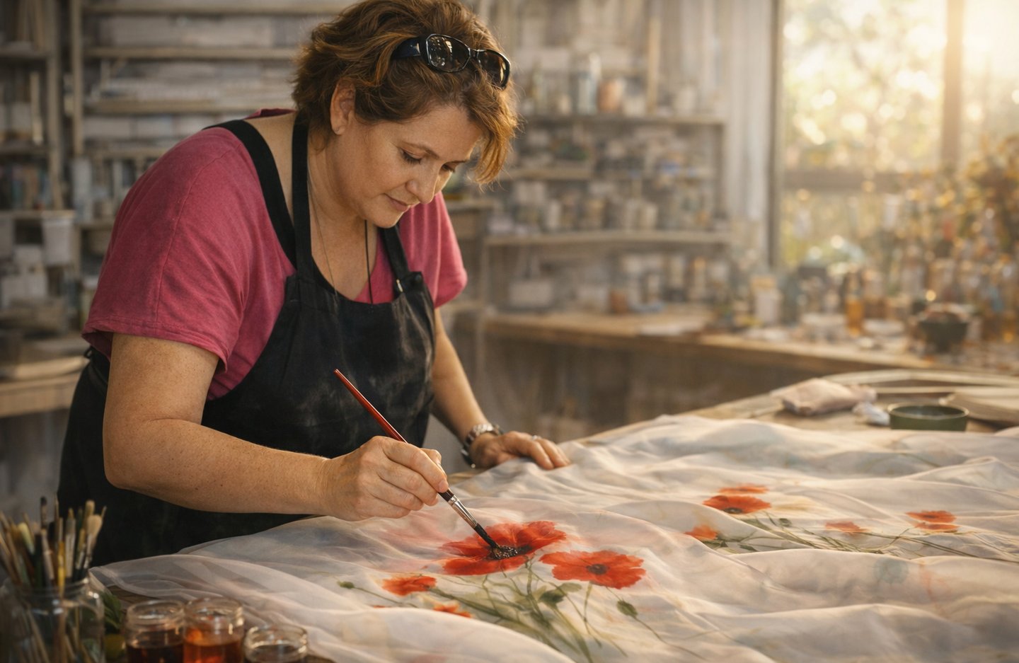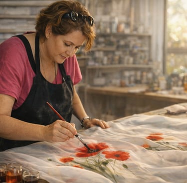 A quiet space where time slows down, and creativity takes form, the atelier is where silk, color, and intuition come together — inspired by the bougainvillea-lined streets of Bodrum and the ever-changing hues of the sea, each piece is carefully brought to life through patience, precision, and artistic devotion.